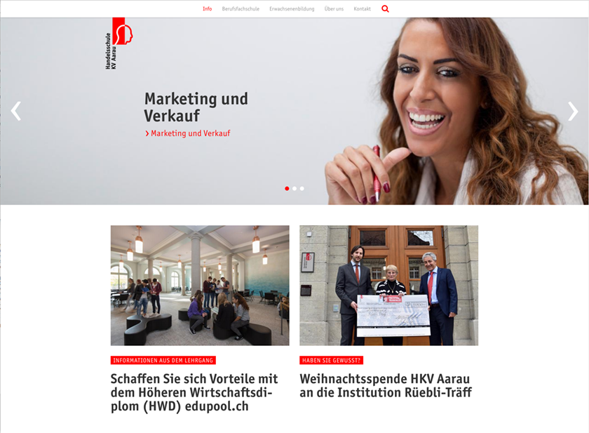 Die HKV Aarau unterstreicht ihre führende Rolle mit einer neuen Website, die dank modularen Elementen dynamisch mitwächst und auch die Integration von Social Media erlaubt. Ein Newsletter dient der regelmässigen Information. Zum neuen Schuljahr läuft eine lokale Kampagne mit Plakaten, Inseraten und Kinowerbung.